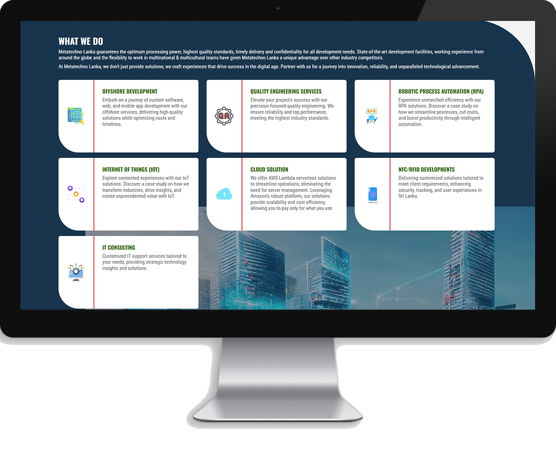 Metatechno Lanka, local subsidiary of the Japanese development firm, partnered with us to revamp its digital identity. We designed and developed a sleek, modern website that clearly communicates their wide array of services, from IT consulting and cloud solutions to mobile app development and RPA. The site features bold visuals, multilingual-ready layouts, and intuitive navigation that enhances user engagement. With a strong focus on structure, performance, and accessibility, the new site effectively reflects Metalanka’s positioning as a reliable technology partner for businesses operating in Japan, Sri Lanka, and beyond.