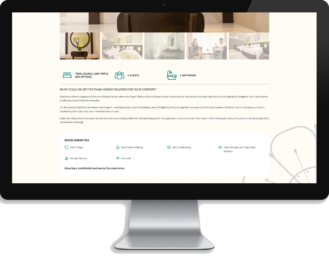 A visually appealing website developed with a channel manager that links the property management system (PMS) that manages rooms and prices. The simple stepped online booking process improves customer experience while effectively driving direct bookings.