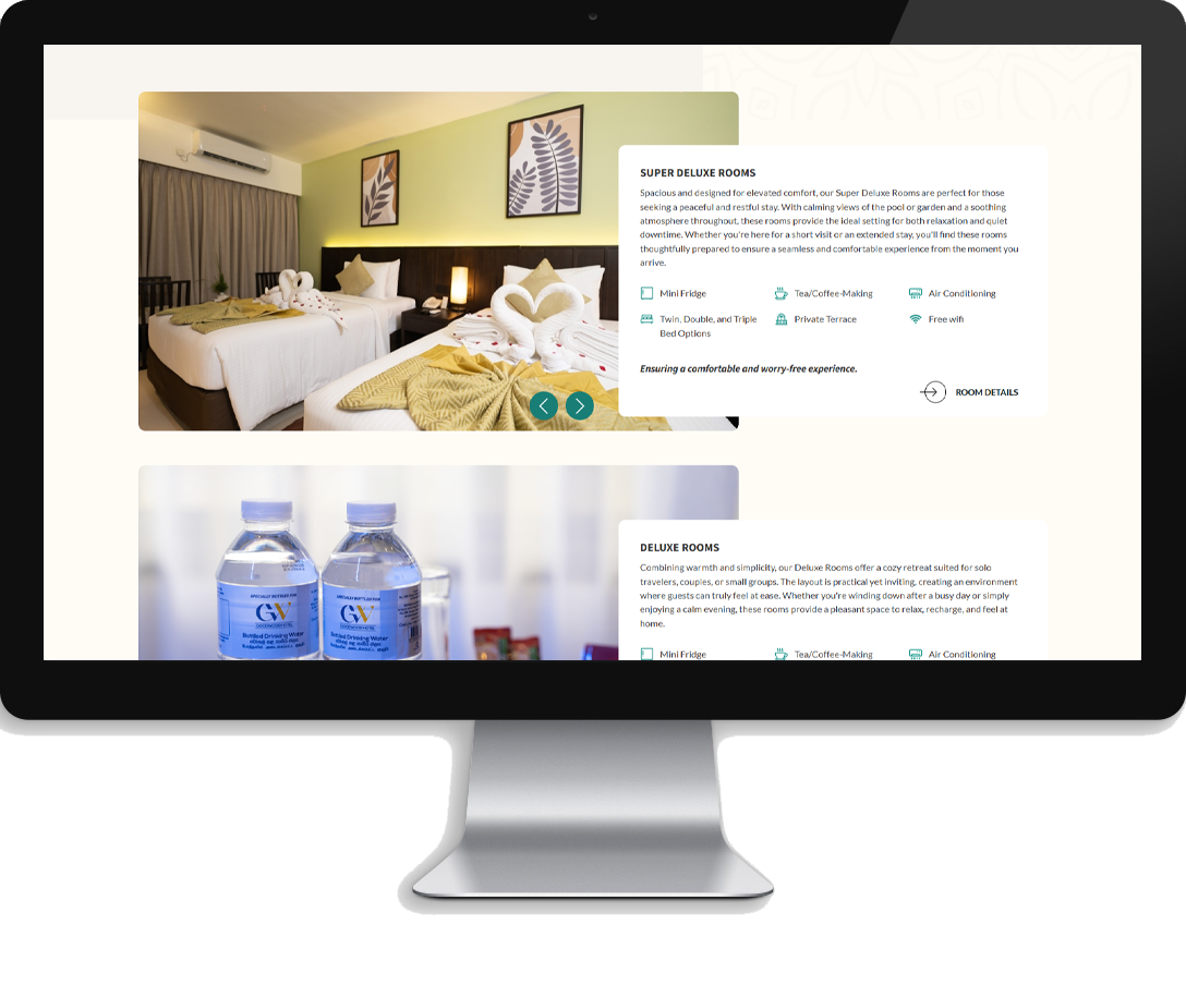 A visually appealing website developed with a channel manager that links the property management system (PMS) that manages rooms and prices. The simple stepped online booking process improves customer experience while effectively driving direct bookings.